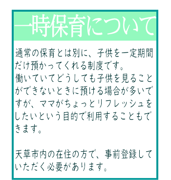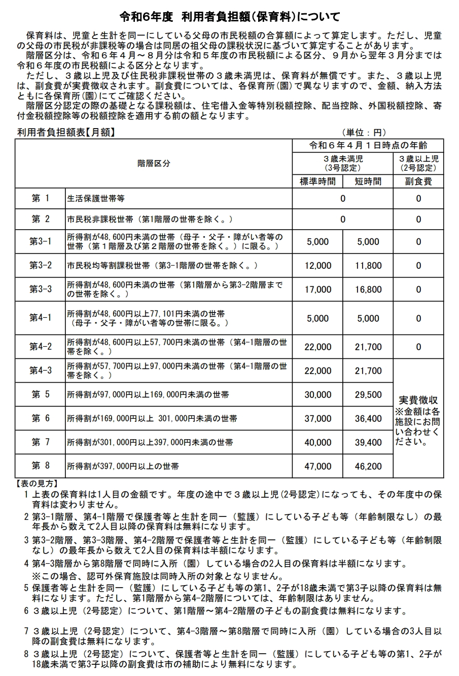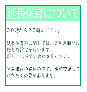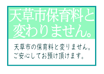 | ◆スポット利用…所定時間を1分超過すれば料金が発生します ◆月極利用…所定時間を過ぎると、スポット利用の延長保育料が加算されます (兄弟割引:2人目半額、3人目以降はさらに半額になります) 入所時3才以上児の主食費 月額1,000円 送迎バス利用料 片道2,000円/月 往復3,000円/月 (兄弟児は2人目以降は、片道・往復関係なく +1,000円/月) スイミング(A組) 月利用料…1,400円 年会費…1,750円(4月入会時) |
