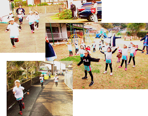 朝、全園児でマラソンを行い、園周を元気いっぱい走っています。