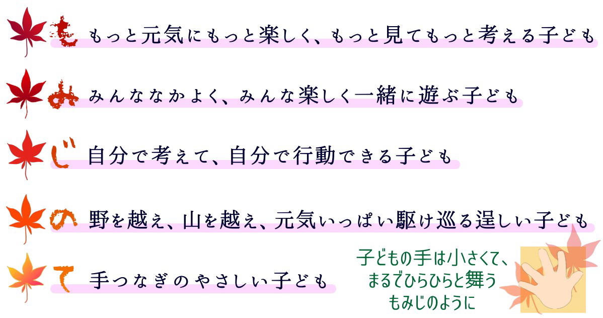 保育の基本理念 もみじ保育園は、「昼間の兄弟」を合言葉に、地域に開かれた保育を目指します。 保育方針 心と体を育てる保育 保育目標 ![]() |